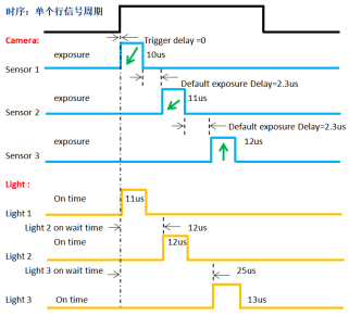 时序原理:当触发信号使能后,相机三行sensor逐行进行曝光,在其各自曝光同时,可以对外响应输出脉冲信号,进行光源控制,分别对应明场光源、暗场光源和背光光源。其中信号延时、信号脉宽等参数均可在相机端进行微调设置