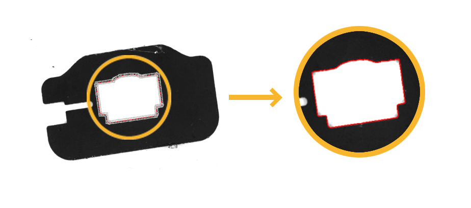 因为要引导激光工艺准确切除残留毛刺,对相机的像素要求比较高,大恒图像此次选用了水星二代家族MER2-U3系列2000万像素面阵相机,该系列相机拍摄时也可满足本项目中最大样品55mm直径需求。结合HALCON算法包二次开发,提供可整体定位轮廓、引导激光打标的方案,在产品容许的公差内准确地区分毛刺,准确提取产品实际边缘轮廓。对于部分客户需要减少CT(cycle time)的要求,本视觉系统也可以做到只提取毛刺切割部分,引导激光工艺精准去毛刺,从而实现“指哪打哪”的效果。为客户节约成本开支,达到提速增效的最终目标。