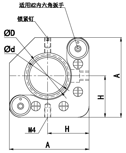 型号 ∅D ∅d H A×A GCM-086820M 20 18.5 26 50×50 GCM-0868254M 25.4 23.9 26 50×50 GCM-086830M 30 28.5 28 52×52 GCM-0868381M 38.1 36.6 32 62×62 GCM-086840M 40 38.5 32 62×62 GCM-086850M 50.8 48.8 36 71×71
