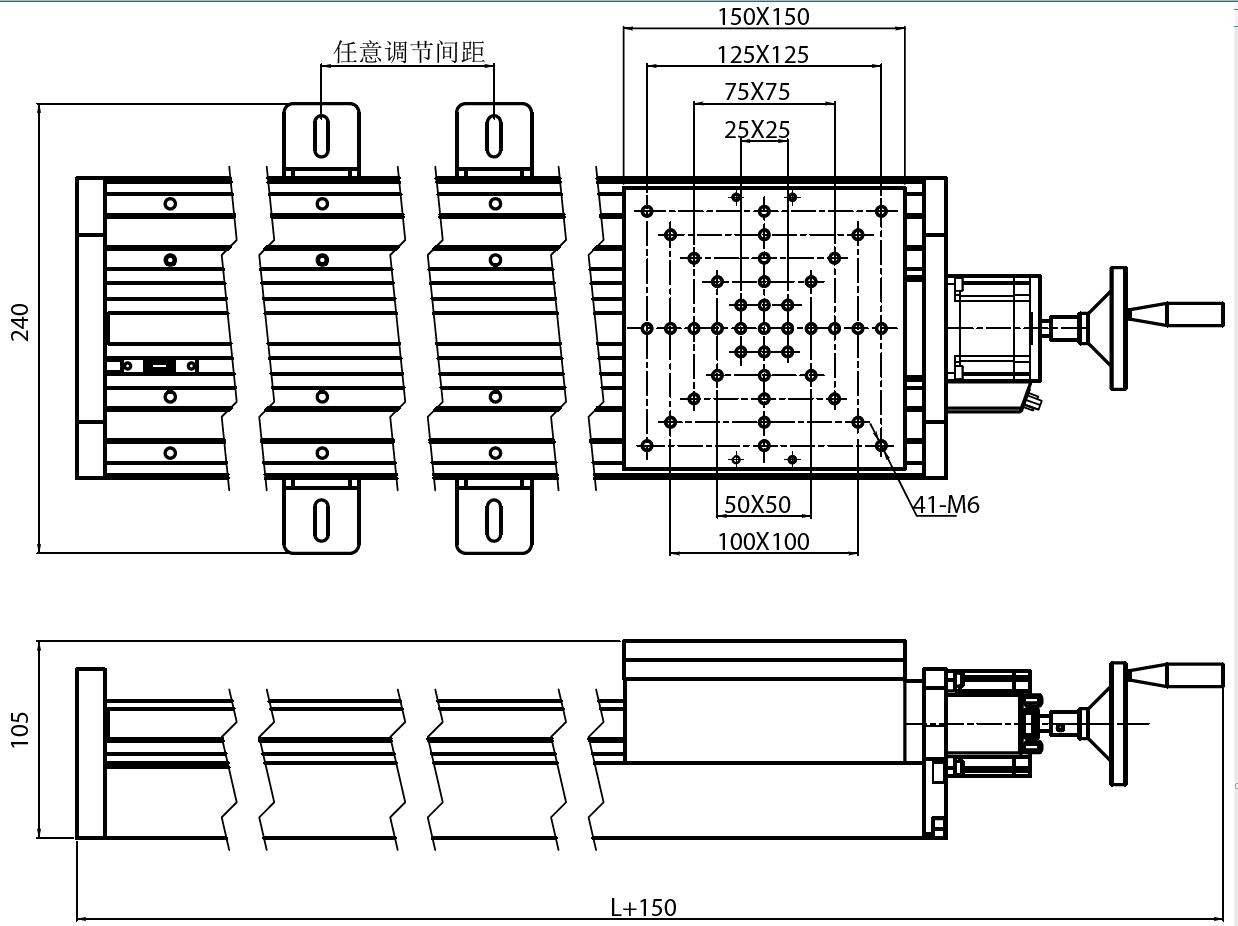 型号 行程 台面尺寸 行程 导轨 丝杠 导程 分辨率/ 单脉冲 重复定位 最大速度 步进电机 水平中心负载 垂直中心负载 安装孔孔距 GCD-302001M 597 150x150 400 光杠导轨 滚珠丝杠 5 0.00125 0.05 10mm/s 1.8° 15kg 15kg (190~220)X 任意调节 GCD-302002M 797 150x150 600 光杠导轨 滚珠丝杠 5 0.00125 0.05 10mm/s 1.8° 50kg 15kg (190~220)X 任意调节 GCD-302003M 997 150x150 800 光杠导轨 滚珠丝杠 5 0.00125 0.05 10mm/s 1.8° 50kg 15kg (190~220)X 任意调节 GCD-302004M 1197 150x150 1000 光杠导轨 滚珠丝杠 5 0.00125 0.05 10mm/s 1.8° 50kg 15kg (190~220)X 任意调节 GCD-302005M 1712 150x150 1500 光杠导轨 滚珠丝杠 5 0.00125 0.05 10mm/s 1.8° 50kg 15kg (190~220)X 任意调节 GCD-302006M 2247 15 0x150 2000 光杠导轨 滚珠丝杠 5 0.00125 0.05 10mm/s 1.8° 50kg 15kg (190~220)X 任意调节