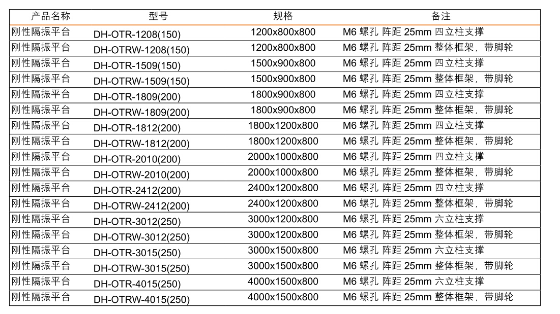 大恒生产的DH-OTR(RW)刚性隔振平台,采用刚性支撑方式。刚性支撑方式又分两种形式:一种采用独立四立柱支撑形式(DH-OTR);另一种采用整体框架形式(DH-OTRW)。两种形式均在支撑的上、下部分采用高隔振性能的阻尼材料,提供很好的隔振效果。平台台面材料选用优质不锈钢,提供良好的刚性和硬度。刚性隔振平台适用于绝大多数的平台应用环境。